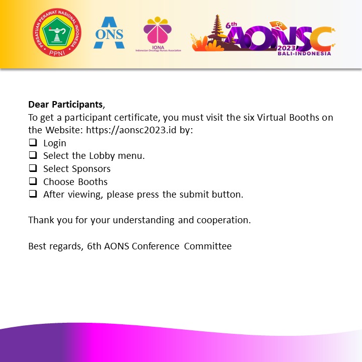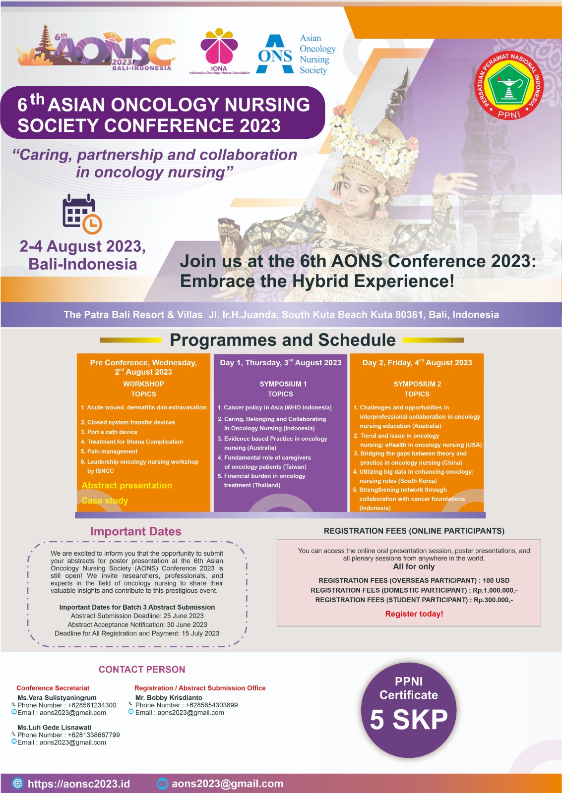 We look forward to welcoming you in Bali on August 2-4, 2023 for the 6th Asian Oncology Nursing Society (AONS) conference. Have a fruitful conference!