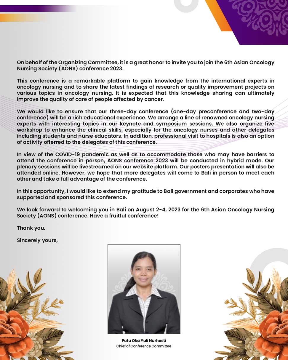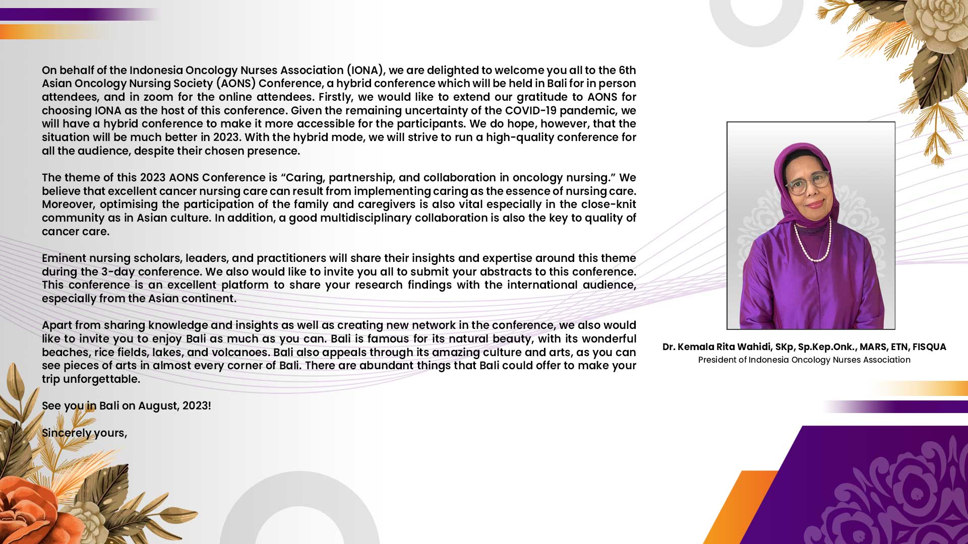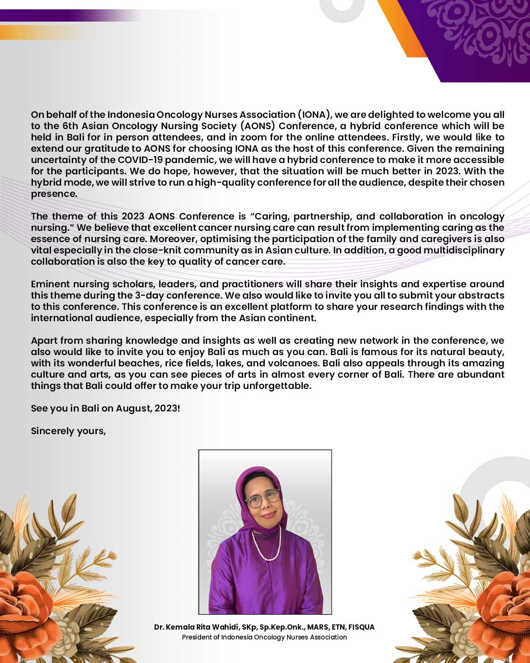 On behalf of the Indonesia Oncology Nurses Association (IONA), we are delighted to welcome you all to the 6th Asian Oncology Nursing Society (AONS) Conference, a hybrid conference which will be held in Bali for in person attendees, and in zoom for the online attendees. Firstly, we would like to extend our gratitude to AONS for choosing IONA as the host of this conference. Given the remaining uncertainty of the COVID-19 pandemic, we will have a hybrid conference to make it more accessible for the participants. We do hope, however, that the situation will be much better in 2023. With the hybrid mode, we will strive to run a high-quality conference for all the audience, despite their chosen presence.