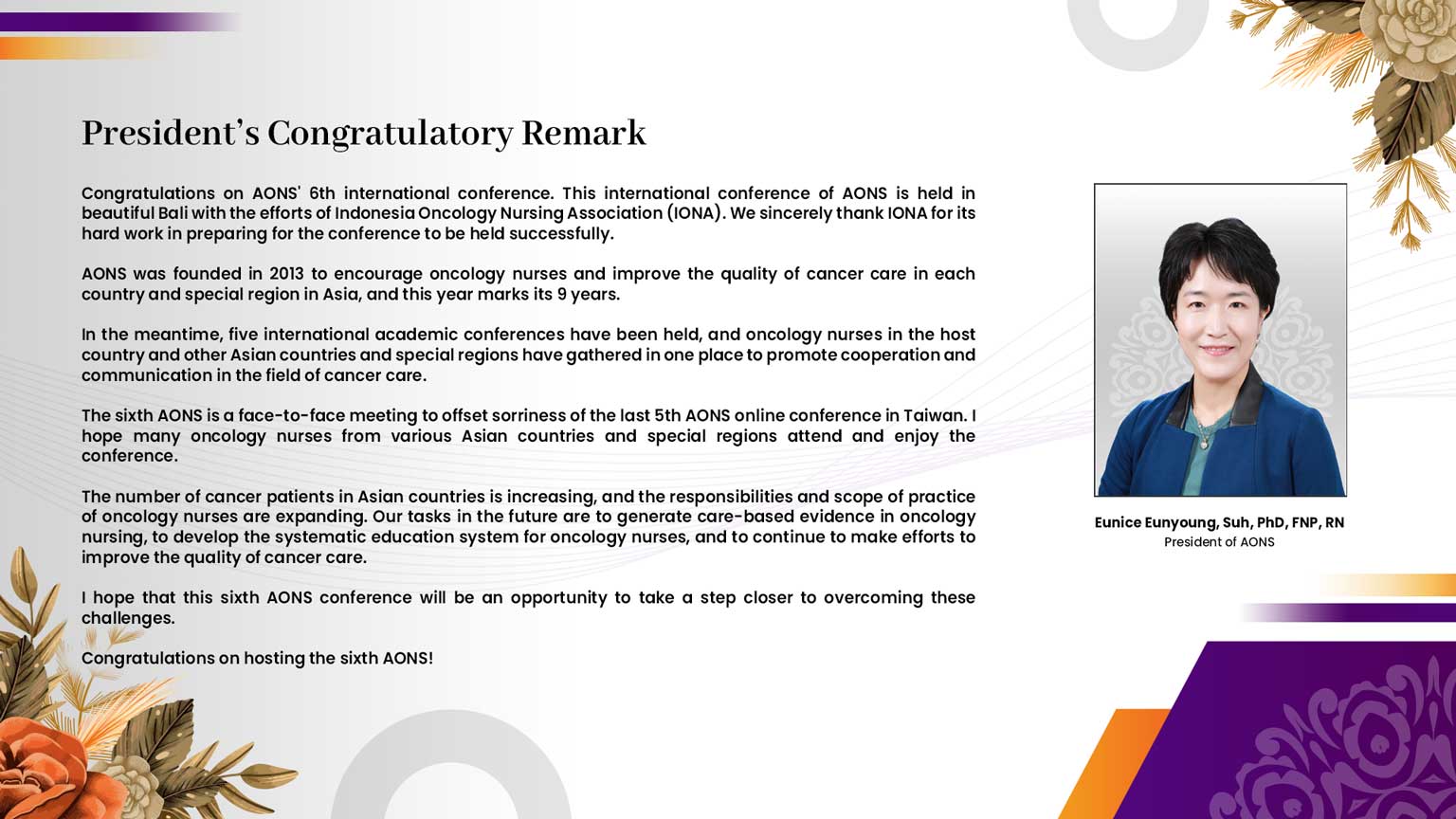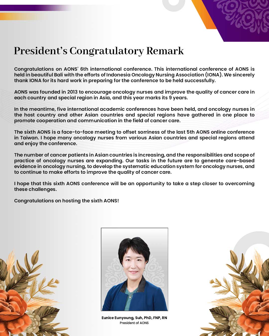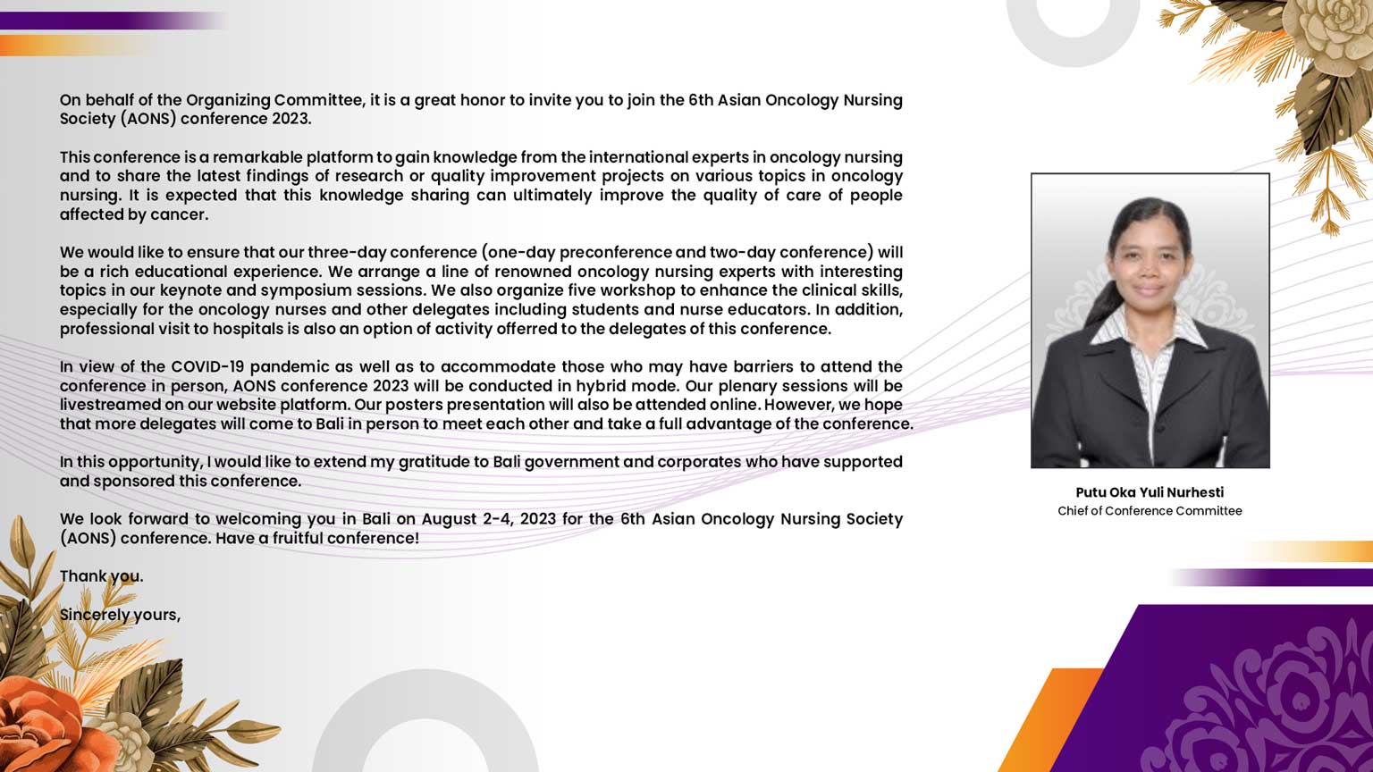 On behalf of the Indonesia Oncology Nurses Association (IONA), we are delighted to welcome you all to the 6th Asian Oncology Nursing Society (AONS) Conference, a hybrid conference which will be held in Bali for in person attendees, and in zoom for the online attendees. Firstly, we would like to extend our gratitude to AONS for choosing IONA as the host of this conference. Given the remaining uncertainty of the COVID-19 pandemic, we will have a hybrid conference to make it more accessible for the participants. We do hope, however, that the situation will be much better in 2023. With the hybrid mode, we will strive to run a high-quality conference for all the audience, despite their chosen presence.